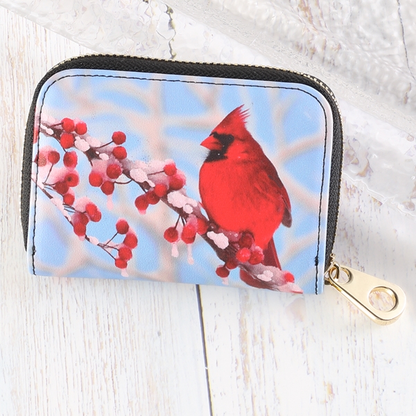 Enjoy this beautiful cardinal design wallet and protect your personal information with RFID blocking technology. Made of faux leather with a fabric interior. Includes 11 dividers and a gold-tone metal zipper. 4 1/4"h x 3h.