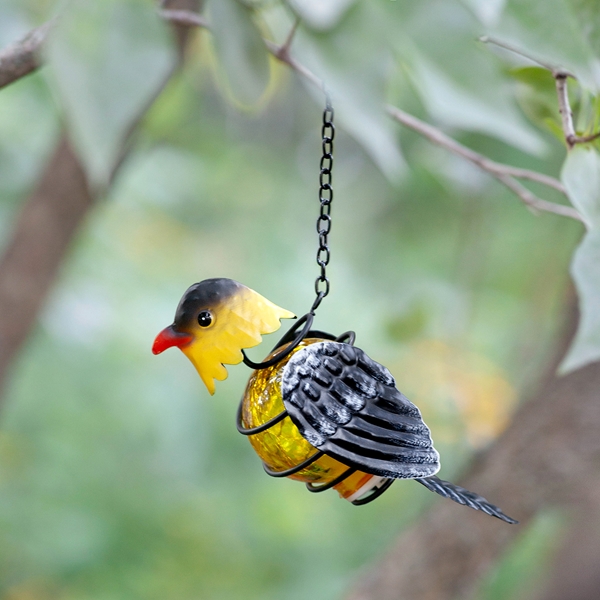This elegant glass solar lantern with fairy lights inside features beautifully colored metal accents to form each bird. Lantern turns on at night and off during the day. Each lantern comes with an on/off switch. Approx. 6"w x 6"h x 3"d.