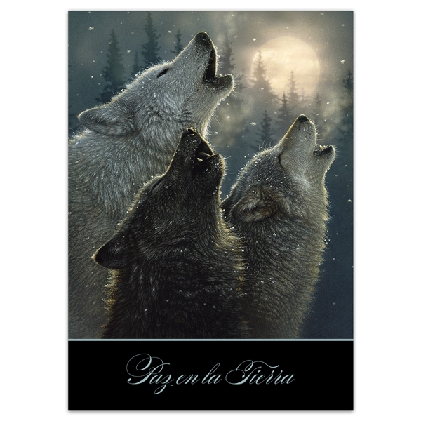 Wolves howl at a full moon in this stunning image while "Peace on Earth" appears below. Made in the USA.