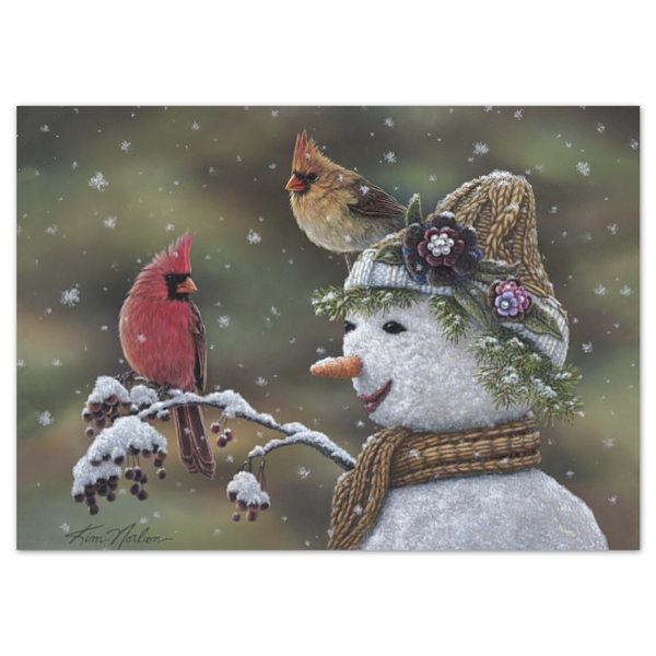 A snowlady with kind eyes and a lovely grin becomes the perch for two foraging cardinals in this adorable painting by Kim Norlien. Made in the USA.