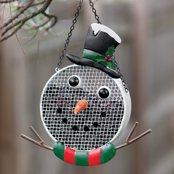 A charming snowman feeder will greet your feathered friends with a big smile! The metal feeder measures 9 3/4"w x 10 1/4"h x 2"d. Chain with hook included.